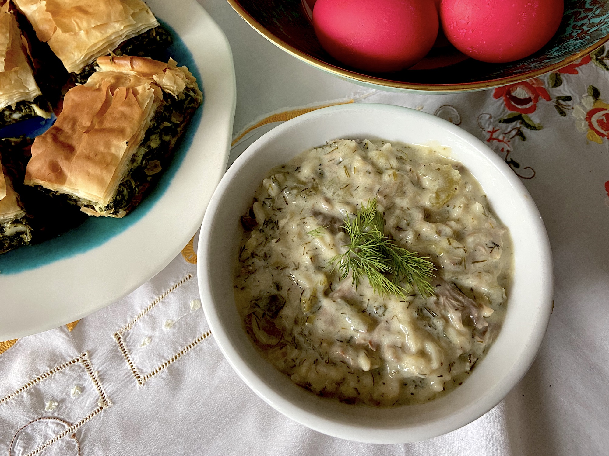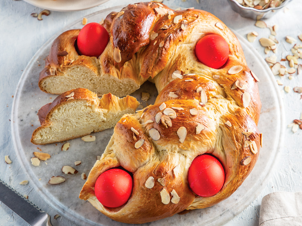 Platillos típicos: Cordero asado, tsoureki (pan dulce con huevo rojo), y magiritsa (sopa de cordero).