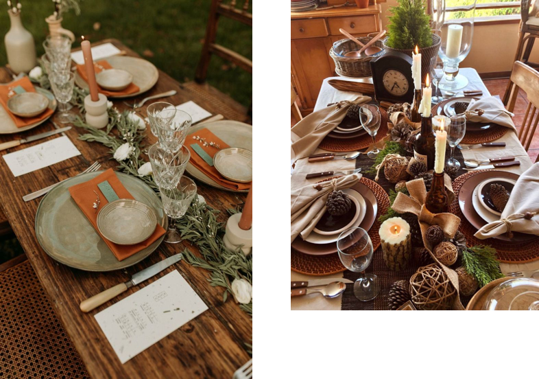 El otoño 2024 se caracteriza por una paleta de colores inspirada en la naturaleza. Los tonos tierra, como el terracota, el marrón, el ocre, y los tonos cálidos como el mostaza, se mezclan con verdes oscuros y azules profundos. Estos colores evocan la transición de las hojas y el paisaje otoñal, creando una atmósfera acogedora tanto en la mesa como en el resto del hogar. Estos colores también contrastan perfectamente con metales como el cobre y el latón, que añaden un toque de brillo sin perder la calidez.