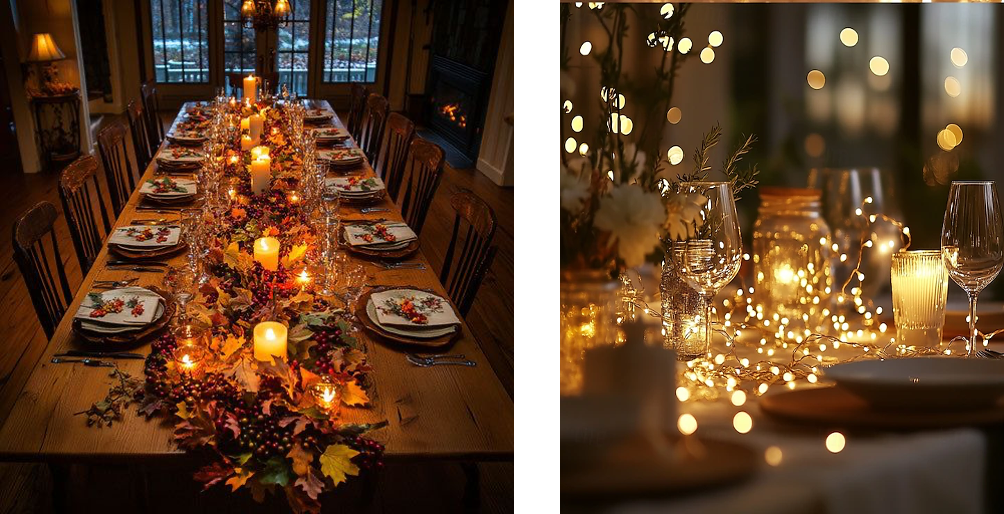 La iluminación cálida sigue siendo esencial en los meses más fríos. Este año se busca crear ambientes íntimos con el uso de velas, candelabros y lámparas de mesa con tonos cálidos. Las velas en diferentes tamaños y formas son una tendencia clave, colocadas tanto en la mesa como en otros puntos estratégicos del hogar. Además, los portavelas de cristal ahumado o tonos dorados dan un toque elegante, mientras que las guirnaldas de luces continúan siendo populares, aportando un aire festivo y acogedor.