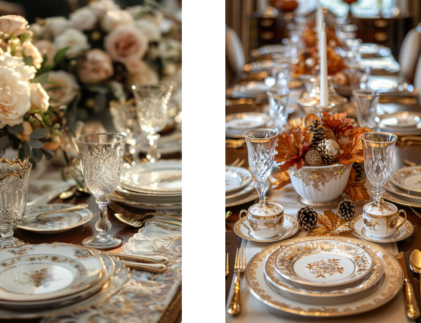 El estilo vintage sigue siendo protagonista en la decoración de mesas. Los platos con diseños florales, bordes dorados o detalles antiguos están de moda, brindando un aire nostálgico y refinado a las reuniones. Este toque clásico se equilibra con la tendencia actual de mezclar lo antiguo con lo moderno, como combinar vajillas vintage con cubiertos contemporáneos de acero mate o cristalería moderna. Las piezas únicas, como jarras de vidrio soplado o vasos coloridos, también ganan protagonismo, personalizando el montaje de la mesa.