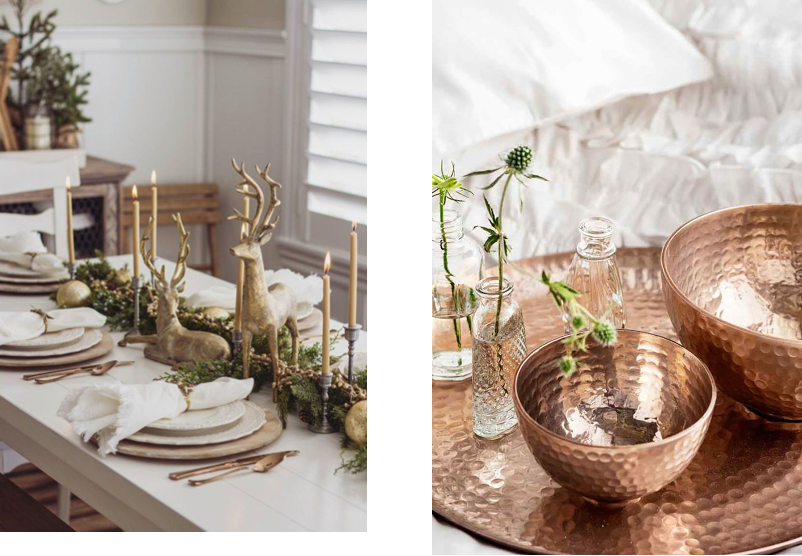 El cobre y el latón son los metales preferidos de la temporada. Desde candelabros y bandejas hasta cubiertos y servilleteros, estos tonos metálicos añaden un toque de elegancia y sofisticación a cualquier espacio. Lo interesante de estos metales es cómo se mezclan con los tonos cálidos y naturales del otoño, creando un contraste perfecto. Además, su capacidad para reflejar la luz añade un brillo sutil que eleva la atmósfera general sin robar protagonismo a los elementos naturales.