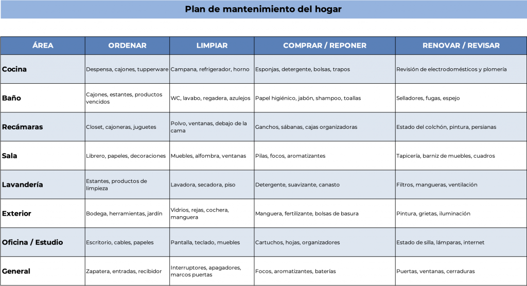 Es una especie de guía, bien organizada y con fechas claras, que nos ayuda a revisar, limpiar, ajustar o arreglar todas las áreas, sistemas e instalaciones de la casa de manera periódica. Se puede dividir por tareas mensuales, trimestrales o anuales, y el objetivo principal es muy simple: evitar el deterioro, detectar problemas antes de que crezcan y asegurarnos de que todo funcione bien.